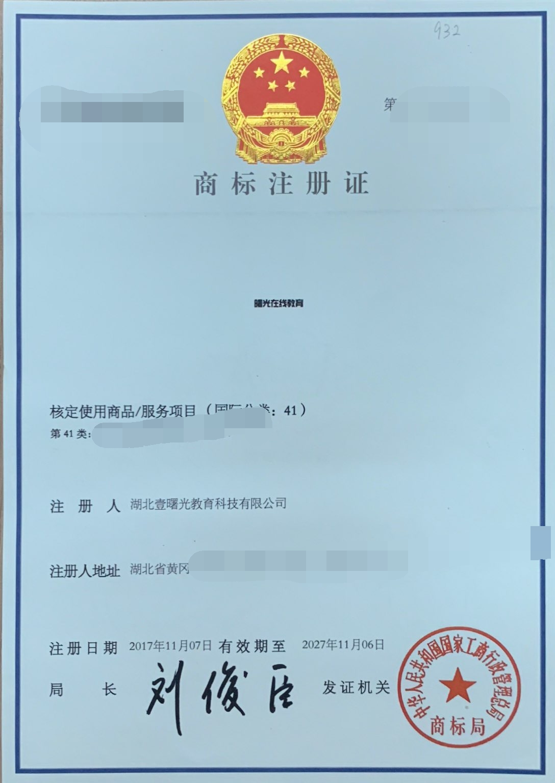 我公司曙光在線教育商標(biāo)注冊(cè)成功